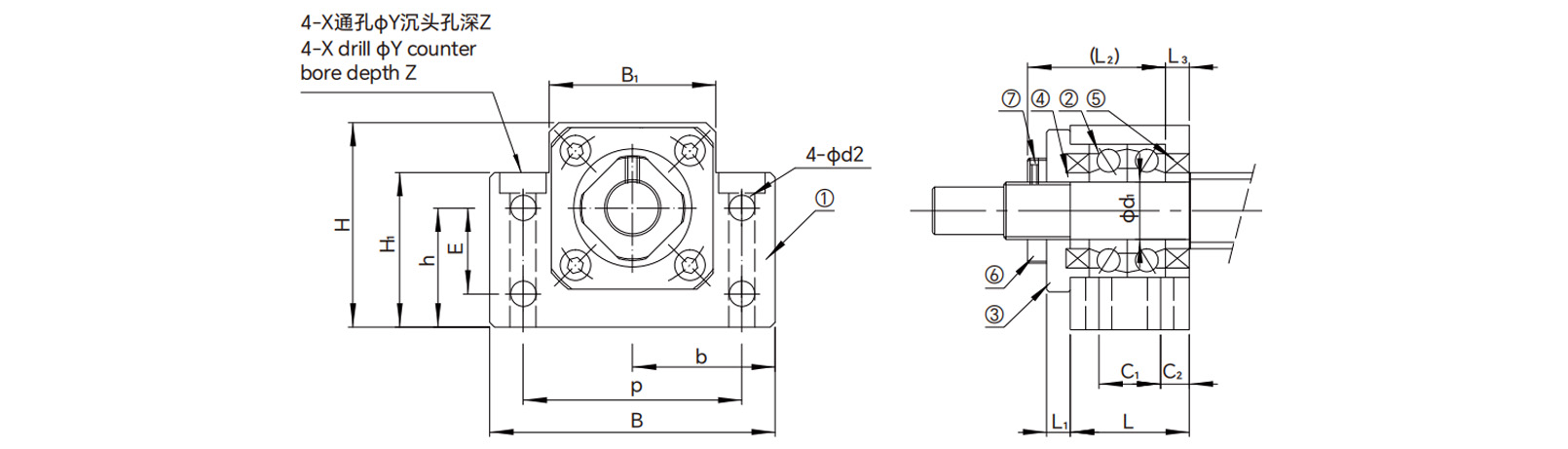 | Modelo no. | Eixo Diâmetro d1 | L | L1 | L2 | L3 | B | H | b ±0,02 | h ±0,02 | B1 | H1 | E | P | C1 | C2 | d2 | X | Y | Z | M | T | Rolamento | Peso (kg) |