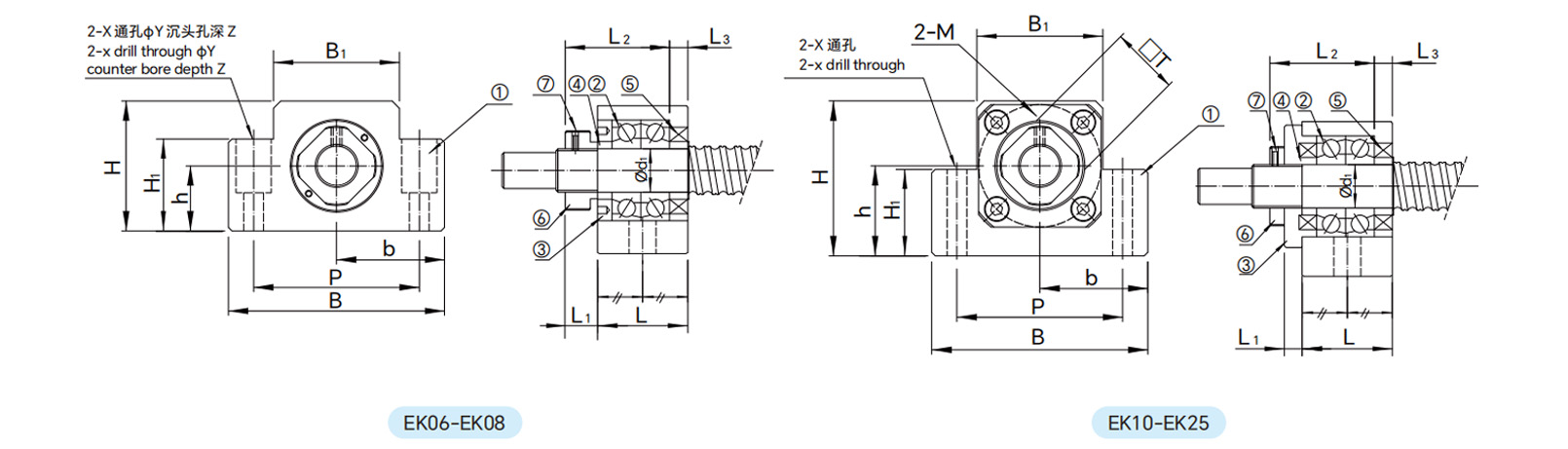 | EK15 | 15 | 25 | 6 | 36 | 5 | 80 | 49 | 40 | 30 | 41 | 25 | 60 | 11 | - | - | M4 | 22 | 6002/7002ZZ | 0.5 |