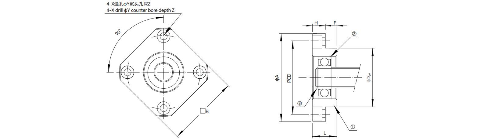 | Características | Montagem de extremidade de suporte da série FF (extremidade flutuante) | Rolamento final de suporte da série BF padrão | Extremidade fixa correspondente (série FK) |