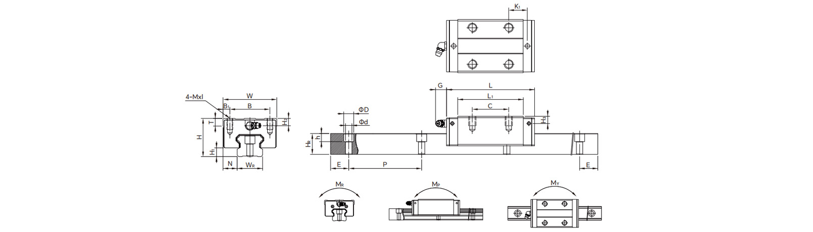 | H | H1 | N | O | B | B1 | C | L1 | L | K1 | G | M×I | T | H2 | H3 | OR | RH | D | h | d | P | E | (milímetros) | C(kN) | C0(kN) | SENHOR kN-m | MP kN-m | MEU kN-m | bloquear kg | Trilho kg/m |