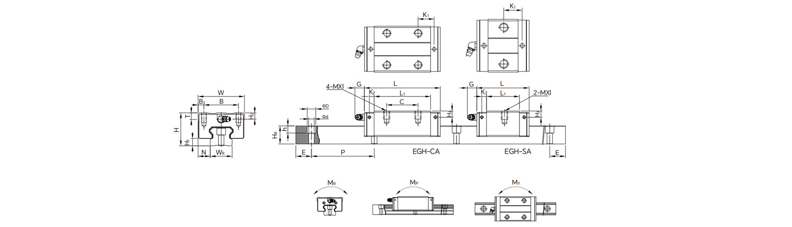 | Dimensões de desempenho | Série EGW-CA/SA (tipo de baixo perfil e largura ampla) | Série EGH-CA/SA (modelo padrão de baixo perfil) | Tipo de grande envergadura de alta montagem (HGW-CC/HC) | Valores Essenciais |