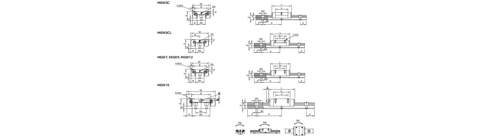 2. Faixa de especificações: Disponível em especificações como MGW7, MGW9, MGW12, MGW15, etc., onde o número representa a largura do trilho-guia (unidade: mm). Para a mesma especificação numérica (por exemplo, MGN9 e MGW9), a série MGW tem uma largura de controle deslizante e uma largura de trilho-guia maiores.